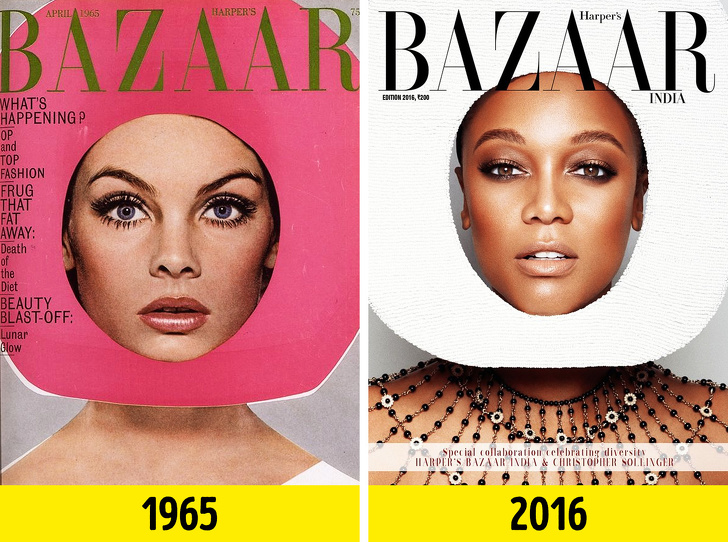 Перша обкладинка вийшла в далеких 60-х з моделлю Джин Шрімптон в головному уборі, схожий на скафандр. Найімовірніше, тоді фотографія була натхненна космічної гонкою: до того часу людина вже вийшов у відкритий космос. Через багато років вийшла обкладинка індійського Harper's Bazaar з явною відсиланням до обкладинці 50-річної давності. Причому індійське видання зробило одразу 9 варіантів, оскільки цей номер був присвячений різноманіттю культур. На обкладинці виявилися корейська і мусульманська моделі, а також красуня Тайра Бенкс.