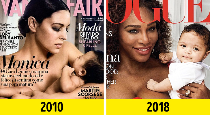 8 років тому Моніка Беллуччі з'явилася на обкладинці італійського номера Vanity Fair зі своєю 5-місячною донькою Леоні. Це був сміливий вчинок не тільки для актриси, але і для видавців журналу. Проте пізніше немовлята не раз виявлялися на обкладинках глянцю. Наприклад, у 2015 році австралійське видання Elle також звернулося до теми матері і дитини. Нещодавно американська тенісистка Серена Вільямс знялася для обкладинки Vogue з 4-місячною донечкою Алексіс Олімпією на руках.