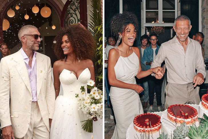 Невелика весільна церемонія моделі Тіни Кунаки і актора Венсана Касселя пройшла на півдні Франції. На торжество були запрошені тільки найближчі члени родини і друзі. В якості весільного вбрання Кунаки вибрала сукню від Vera Wang.