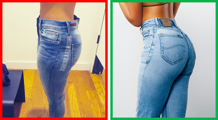 - Наприклад, вибираючи джинси з високою посадкою, потрібно звернути увагу на відстань від пахового шва до нижнього краю ширінки — воно не повинно бути більше 7-9 див. Якщо ж ця відстань дуже велика, ми отримуємо безглуздий спосіб, що наводить на думку про те, що штани натягнуті вище, ніж потрібно.