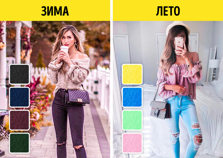 - Набагато більш доцільно поділ кольору джинсів «по сезону». Чорні, індиго, складні, багаті кольори — будь-які темні джинси добре поєднуються з «утепленим» чином, чудово вписуючись в зимові та осінні ансамблі. Світло-блакитні, білі, чисті «цукеркові» кольору незамінні для створення весняно-літніх комплектів. Синій денім — поза часу, простору і конкуренції.