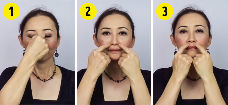 Японський масажист-терапевт Ясуко Кавамура (Yasuko Kawamura) радить проводити такий масаж обличчя при нежиті: