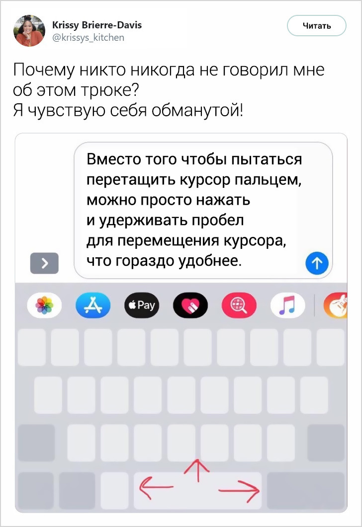 Нещодавно користувачі твіттера знайшли засекречену функцію клавіатури на айфоне, для багатьох вона стала одкровенням. Виявляється, не потрібно переміщати курсор на екрані пальцем, регулярно промахиваясь повз необхідних букв. Слід просто натиснути будь-яку кнопку на віртуальній клавіатурі: управління курсором стане набагато зручніше.