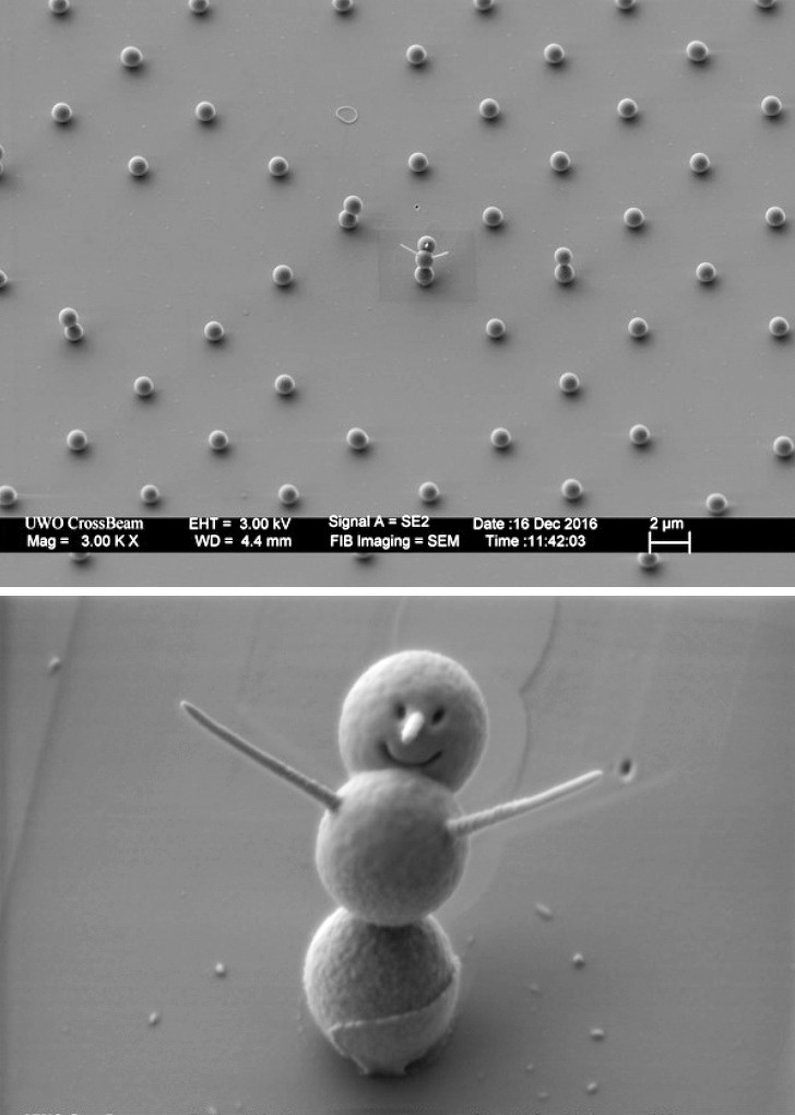 Для порівняння: товщина людської волосини — 75 мікрон. Щоб створити такого сніговика, вчені за допомогою електронно-променевої літографії поставили один на одного три сфери кремнезему розміром 0,9 мікрона кожна. Очі і рот вирізали за допомогою сфокусованого іонного пучка, а руки і ніс — з платини. Хто сказав, що наука — це не весело?