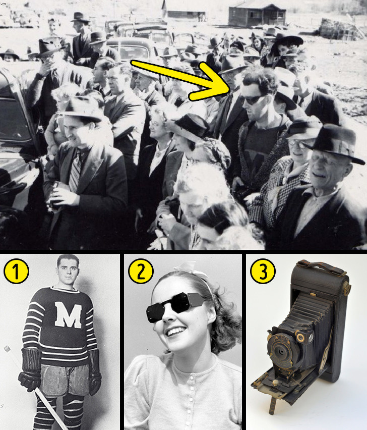 Чоловік одягнений у фанатську футболку хокейної команди Montreal maroons. Подібні сонцезахисні окуляри носили тоді полярники, але вони були в моді і у простих людей. А в руках — модель кишенькової камери Kodak, яка вийшла ще в 1925 році.