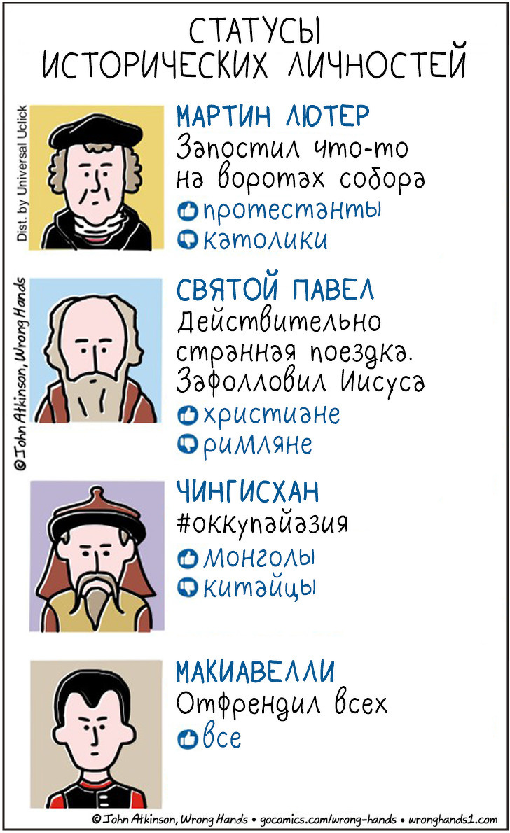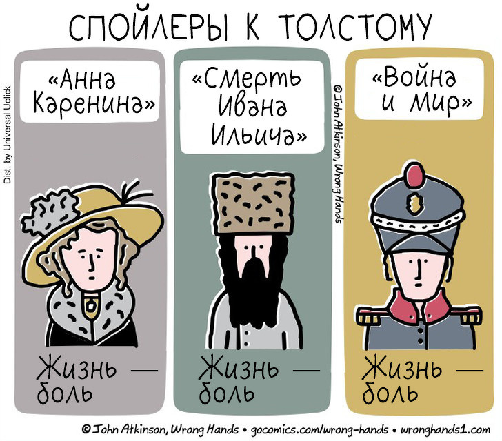 Художник з Оттави Джон Аткінсон називає себе «Не ті руки». Під цим псевдонімом він малює комікси, в яких дохідливо пояснює своїм читачам, що відбувається навколо них. Канадець ділиться своєю творчістю у себе в Facebook і Twitter. Він збагнув логіку дій історичних особистостей, зрозумів, що таке ксенофобія, розібрався в інтригах «Ігри престолів» і зміг легко пояснити співвітчизникам, про що писав Лев Толстой. Художник навіть випустив книгу, в якій спойлерит класику, в тому числі і російську.