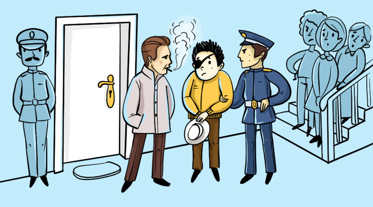 5. Замкова свердловина на двері влаштована таким чином, що підглянути в неї можна тільки правим оком. А у злочинця на правому оці пов'язка, яка вказує на те, що він бачить тільки лівим.