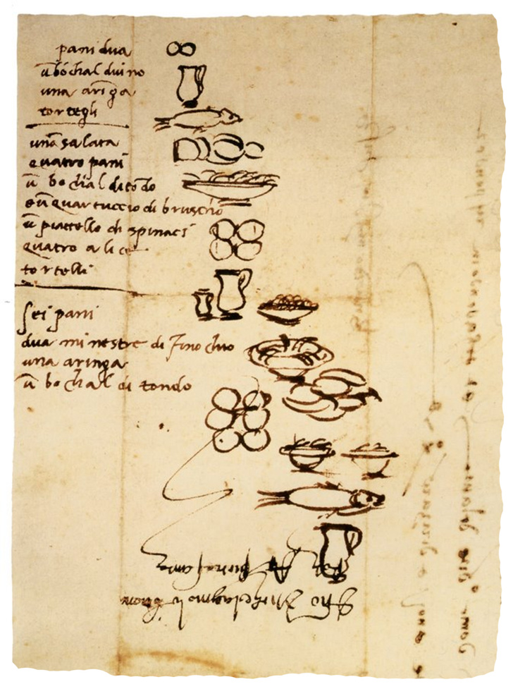 Але робив він це не просто так. Як кажуть історики, слуга Мікеланджело був неписьменним, тому художник дбайливо малював, що і в якій кількості потрібно купити. З 500-річного списку ми можемо побачити, що художник ділив денну порцію їжі на три прийоми, кожен з яких включав вино, рибу і хліб.