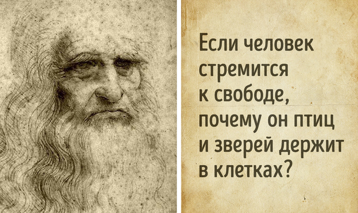 Сам Леонардо у своєму щоденнику писав: «Якщо людина прагне до волі, чому він птахів і звірів тримає в клітинах? Людина воістину цар звірів. Але ми живемо, вбиваючи інших. Ми ходячі кладовища! Ще в ранньому віці я відмовився від м'яса».