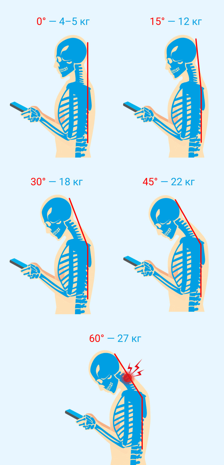 Таким чином, коли ви нахиляєте голову на 60°, щоб запостити фото в instagram, то можна вважати, що на вашій шиї сидить невидимий 8-річна дитина. Ця навантаження може призвести до зміщення міжхребцевих дисків, виникнення болю та раннього зношування шийного відділу хребта.