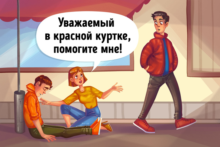 Тому, якщо вам терміново необхідна допомога, виберіть конкретної людини і звертайтеся особисто до нього. У цьому випадку шанс отримати допомогу набагато вище, ніж якщо ви будете звертатися відразу до всіх або мовчати, сподіваючись на співчуття натовпу.