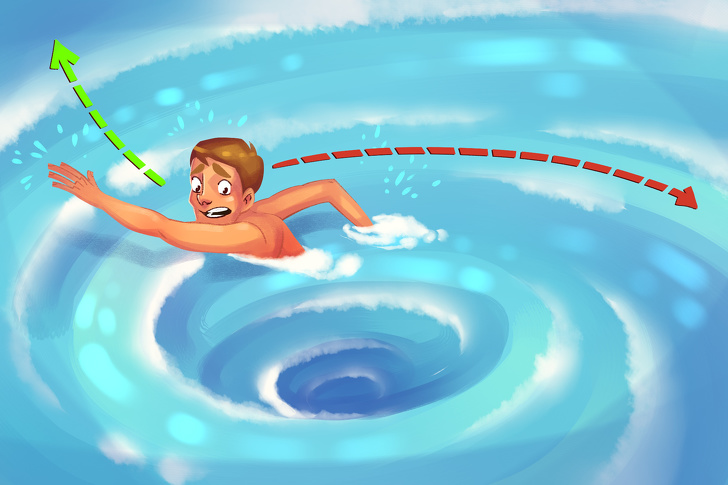 - Не потрібно боротися з круговою течією, краще берегти сили, не сходьте з ритму дихання. Якщо ви відчуваєте, що вас затягує у вир, намагайтеся гребти по напрямку обертання води, методично випливаючи в сторону від центру воронки.