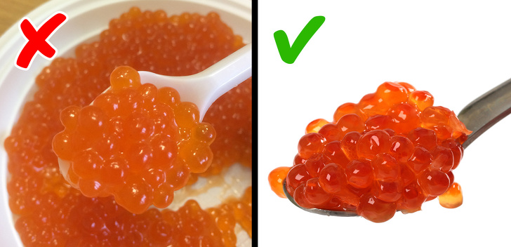 - Справжня ікринка по своїй суті — це яйце. Ось чому вона не схожа на однорідний шар. Всередині можна побачити зародковий диск, жирові краплі. Якщо немає вкраплень, ікра підроблена.