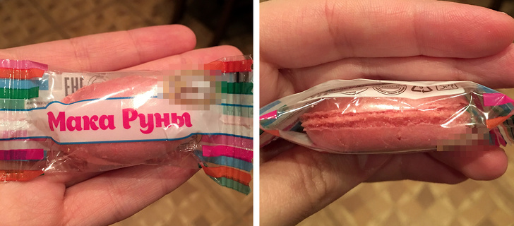 А є ще макарун (macaroon). Цей десерт теж містить мигдальне борошно, але з вигляду більше схожий на печиво. Недосвідчені ласуни плутають назви, багато продавців теж не в темі. Починаються ігри зі словами (приклад — на фото нижче).