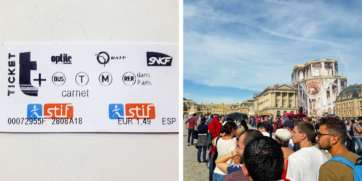 Зліва — квиток на метро за зниженою ціною € 1,49. Праворуч — черга бажаючих відвідати Версаль.