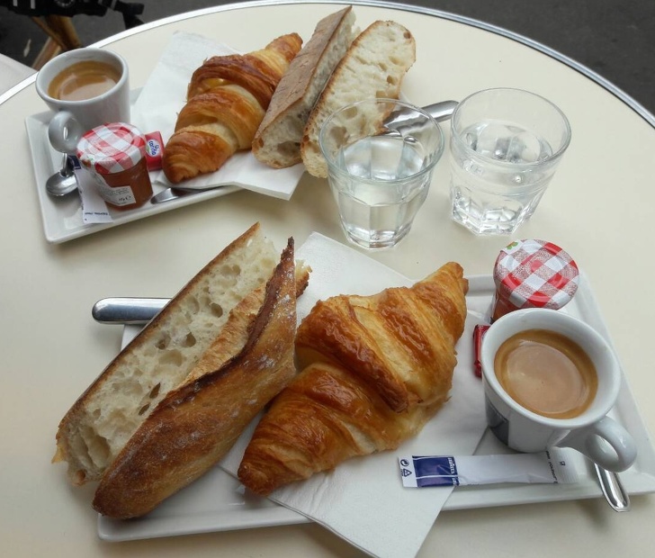 Типовий французький сніданок вартістю € 7,5. У нього входять: чашка еспрессо або кава з вершками на вибір, половина багета, круасан, кубик вершкового масла і маленька баночка варення.