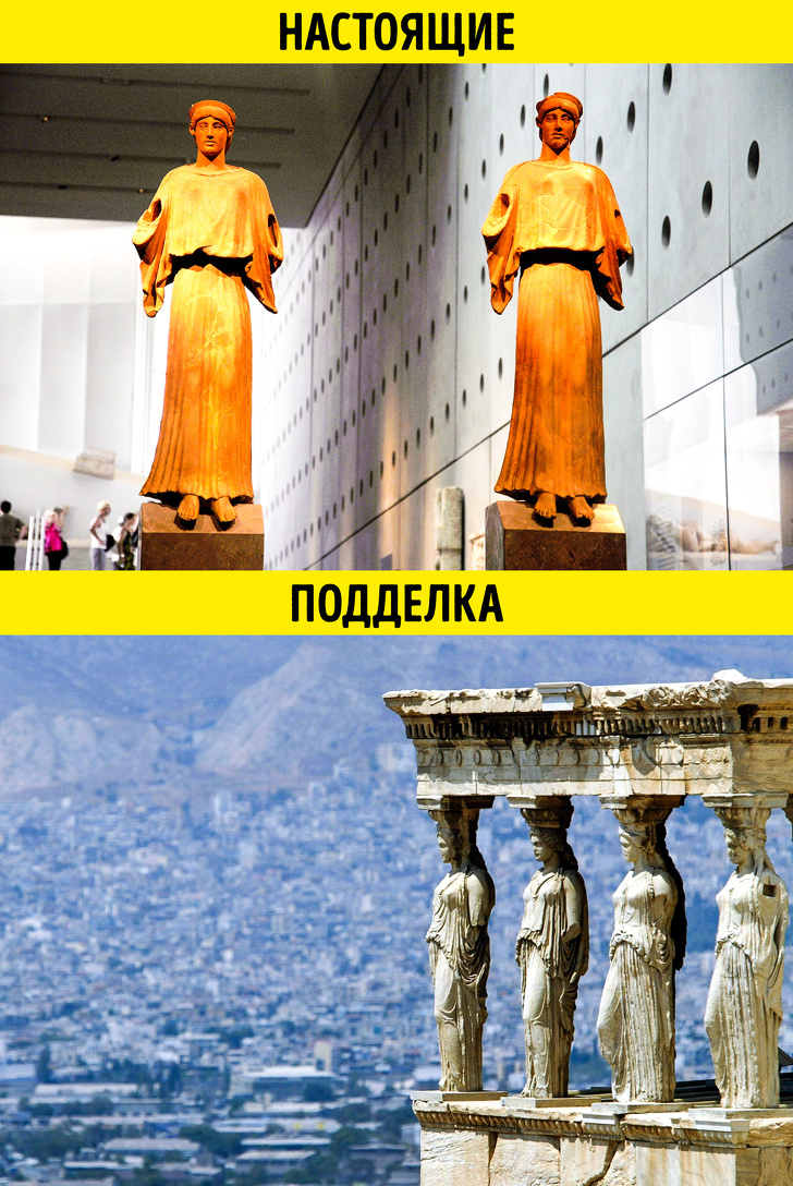 Але саме вони і є фейком. Справа в тому, що замість давніх статуй в Афінах туристам показують копії. Оригінали ще в XIX столітті вивіз посол Британії в Османській імперії (до складу якої тоді входила Греція). Зроблено це було з метою збереження пам'ятників античного мистецтва. Зараз їм нічого не загрожує на батьківщині, але вони все ще зберігаються в Британському музеї, і повертати їх ніхто не поспішає.