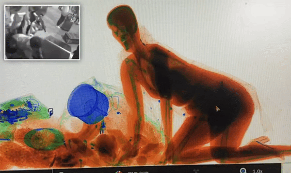 У лютому 2018 року в одному з китайських вокзалів округу Дунгуань жінка так переживала за свої речі, що полізла за ними в сканер. Результатом стала ця фотографія. Чому жінка так хвилювалася за свою сумку — невідомо. Адже нічого забороненого у неї знайдено не було.