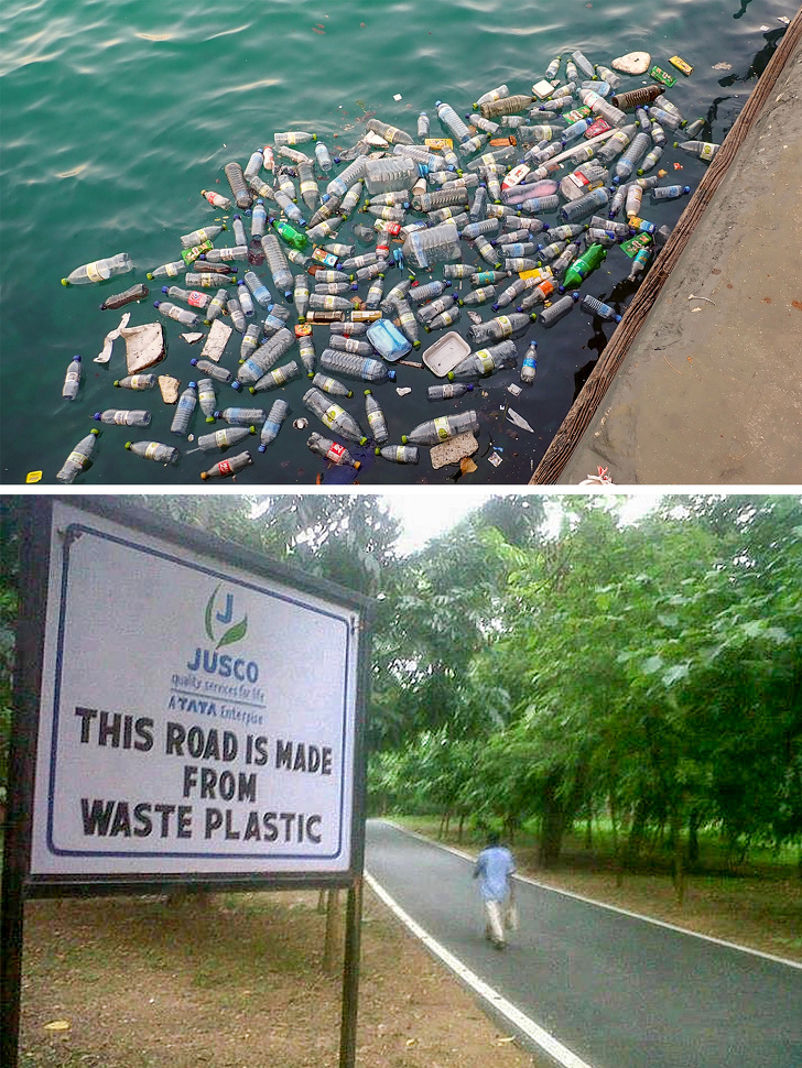 У 2001 році Індія розпочала будівництво доріг з подрібнених пластмасових відходів. Пластик змішують і плавлять при температурі 170 °C, потім додають гарячий бітум і укладають матеріал як звичайний асфальт.