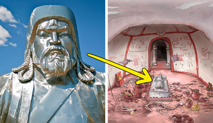 Чингісхан — великий хан і засновник найбільшої в історії континентальної імперії. Згідно із заповітом, його потрібно було поховати там, де ніхто не міг би знайти його останки. Тому похоронний ескорт віз його тіло вглиб пустелі, вбиваючи всіх на своєму шляху. А коли воїни похоронної процесії повернулися, вони були також негайно вбиті. Могилу Чингісхана не знайшли до сих пір, тому що не залишилося нікого, хто хоч приблизно знав би про її розташування.