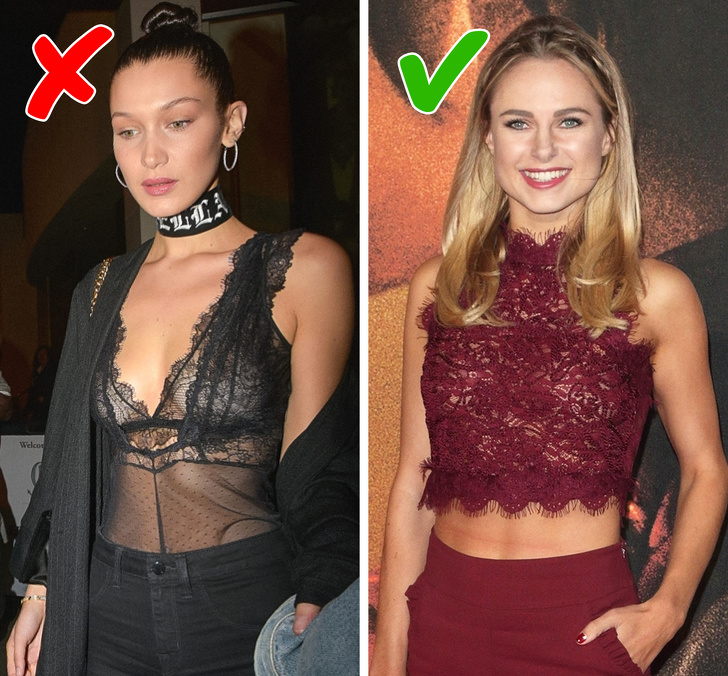 - Якщо одяг відверто прозора, ліфчик слід замінити на мереживний бралетт або обтягуючу майку в колір блузи.