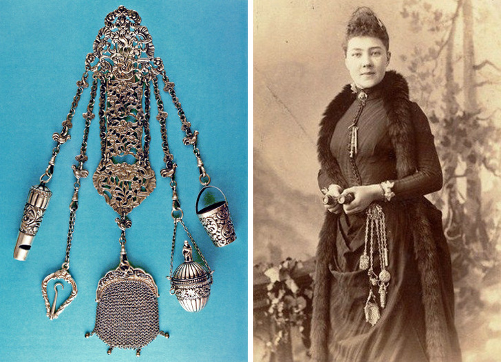 Одяг XIX століття не мала кишень, а сумки в моду ще не увійшли, тому всі необхідні дрібниці жінки носили з собою в шатленах. Шатлен (з фр. «господарка замку») являв собою прикрасу і аксесуар у вигляді ланцюжка з затиском, до якої кріпилися різні предмети: ключі, гаманець, годинник, ножиці, записні книжки, духи, косметика і т. д.