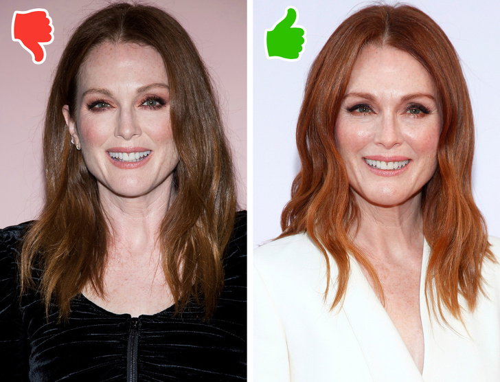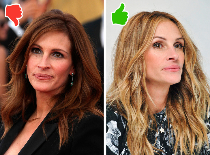 По-перше, вибирайте теплі відтінки. Якщо пофарбувати волосся в попелястий блонд, то це швидше додасть вам років, ніж візуально омолодить. По-друге, необов'язково повністю освітлювати волосся, досить додати в зачіску світлі пасма натуральних відтінків. Це допоможе освіжити навіть теплий коричневий тон волосся, який йде далеко не всім.