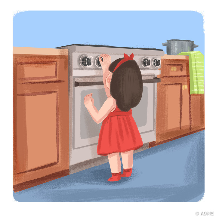 Щоб виключити небезпечні ігри з газовою плитою, надягніть на вимикачі блокуючі ковпачки, завдяки яким «коліщатка» перестануть повертатися. А якщо ви поставите в мийці змішувач з терморегулятором і встановіть ліміт температури, то дитина не обпечеться занадто гарячою водою.