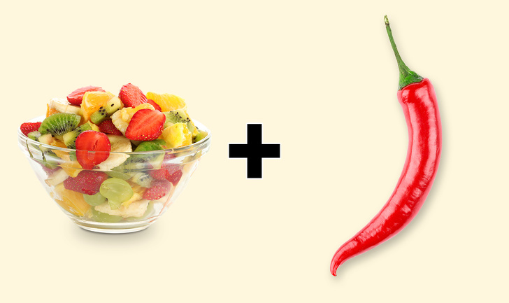 Мелений перець чилі з фруктовим салатом — традиційне мексиканське блюдо. Завдяки капсаицину, який міститься в чилі, посилюється смак фруктів.
