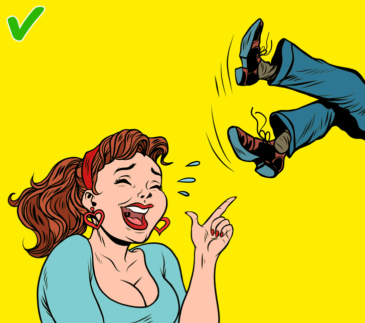 Мова йде, наприклад, про чиєсь несподіване або цілком очікуване падіння — як у фільмах, коли персонаж сковзається на банані. Насправді все просто, і реакція у вигляді неконтрольованого сміху — це банальна психологічна захист, механізм, який звичайно формується ще в далекому дитячому віці при зустрічі з чимось неприємним. Основні ознаки цього захисту — заперечення / спотворення дійсності і дію на несвідомому рівні. Бачачи, як інший чоловік забився, ми мимоволі приміряємо його біль на себе, лякаємося з-за цього і реагуємо протилежної реакцією, щоб не впасти в паніку. Таким чином, можна зробити висновок, що чим «смішніше» вам в такій ситуації, тим сильніше ви насправді приміряли біль іншої людини на себе.