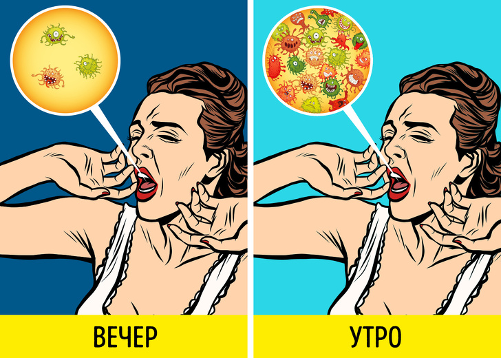 Слина — це природний захист порожнини рота. Вона вбиває і змиває бактерії з їх продуктами життєдіяльності, а також розчиняє і нейтралізує погано пахнуть сірчисті з'єднання. Таким чином, нескладно здогадатися, що, коли ми сглатываем слину, з рота кожен раз вимиваються мільйони бактерій і частинки їжі, якими ці бактерії як раз і харчуються. Вранці запах з'являється з-за того, що вночі у нас в роті менше слини і ми значно рідше її сглатываем, відповідно, не знищуються мікроби, а, навпаки, розмножуються, накопичуються і розкладаються.