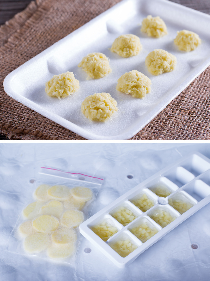 Дуже непоганий і зручний спосіб для заморозки імбиру і часнику — це натерти їх на тертці, дрібно нарізати або прокрутити через м'ясорубку і в такому вигляді просто загорнути у фольгу або харчову плівку. А можна і розкласти у формочки для льоду. Так вони збережуть свої антибактеріальні властивості і будуть зберігатися довше, ніж зазвичай.