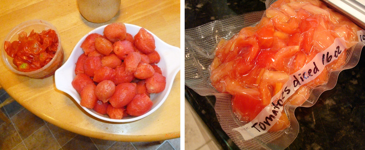 Для використання в супи і рагу краще нарізати помідори кубиками, для випічки — кружками, а для соусів ви можете помідори подрібнити блендером з якимись травами і заморозити їх в невеликих формочках для льоду. Також можна заморозити помідори цілком, для цього опустіть їх ненадовго в окріп, зніміть шкірку і відправте в морозилку на таці, після того як вони замерзнуть, можете розкласти їх по пакетах або контейнерах.
