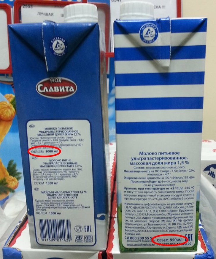 - Вивчайте етикетки і порівнюйте вагу. Чи є сенс платити за бренд? Якщо ви теж не бачите різниці — вибирайте аналогічний товар, який може бути на 20 % дорожче, а вага — на 50 % більше. Найчастіше товар має ціну нижче не тому, що у нього реально вигідна ціна, а тому що він за обсягом або вагою менше. Наприклад, обсяг пакета молока може бути не 1 л, а 900, 905 або 950 мл