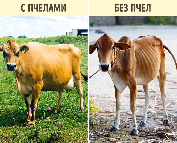Рогата худоба можна годувати зерном, висівками і комбікормом, але без олійних культур (які запилюють тільки бджоли) тварини не зможуть набрати належну масу. Без бджіл корови почнуть хворіти, втрачати вагу, у них з'являться проблеми з серцем, а їх м'ясо стане несмачним. Навряд чи вам захочеться назавжди відмовитися від улюблених страв або купувати м'ясо, вирощене на гормонах.
