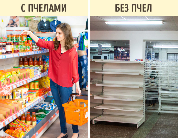 Магазини Whole Foods в рамках експерименту залишили на вітринах молочні продукти, які теоретично могли б бути доступні без бджіл. Покупці явно залишилися не в захваті, адже близько 50 % продукції просто зникло. Потім такий же експеримент виконали з овочами і фруктами: з прилавків повністю прибрали капусту, яблука, морква і багато іншого. Потрібно розуміти, що на продукти ціни підскочать до небес і перестануть бути доступними більшості населення.