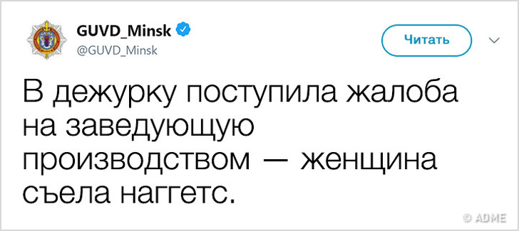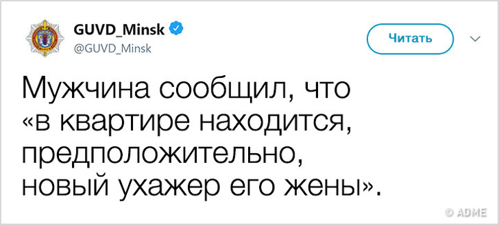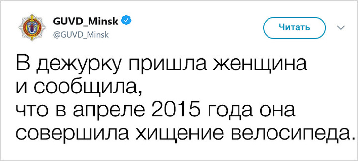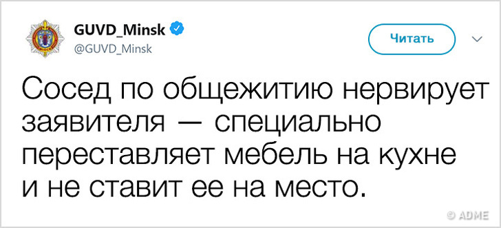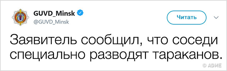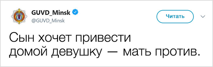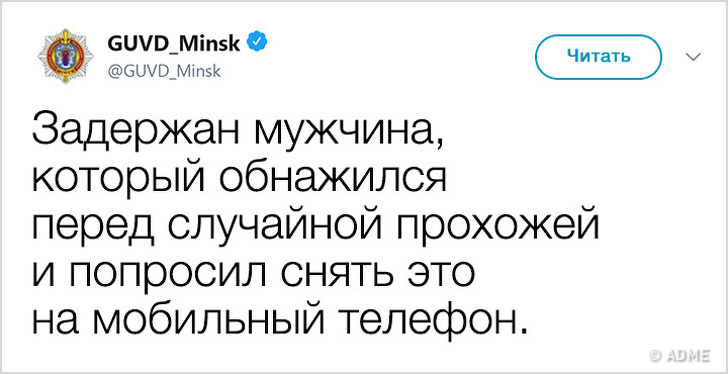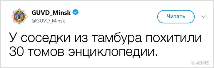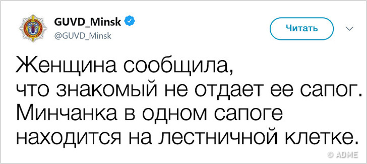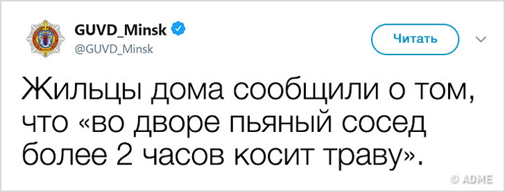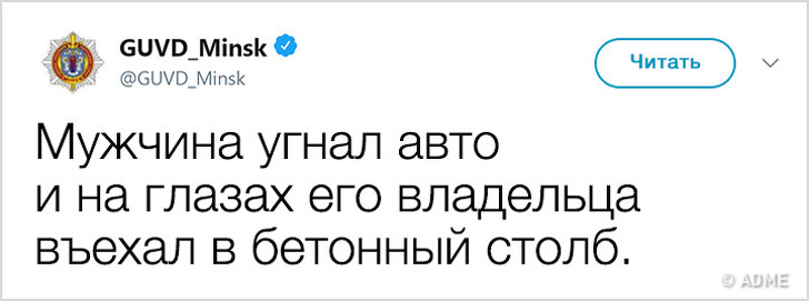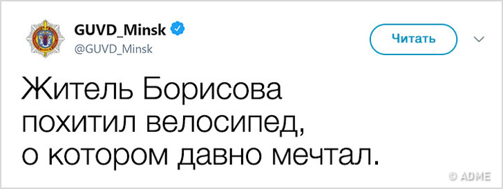 У 2017 році Білорусь показала низький індекс злочинності і увійшла в топ-10 найбільш безпечних країн світу. Правоохоронні органи в Мінську не тільки чудово справляються зі своїми обов'язками, але і знайшли сучасний спосіб оповіщення громадян: з твіттера ГУВС мінчани дізнаються багато важливого і корисного, а деякі порушники спокою, чиї вчинки зовсім не піддаються логіці, викликають посмішку. Якщо і вам хочеться дізнатися трохи більше про трудові будні міліції, а також зарядитися гарним настроєм, то ця стаття для вас.