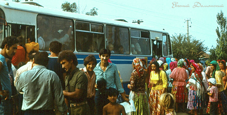 Фотограф Євген Доманський зобразив, як чоловіча і жіноча частини табору циган-котляров заходять в автобус через різні двері, щоб не стикатися.