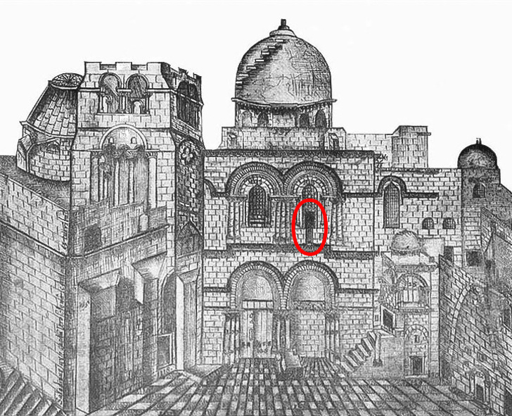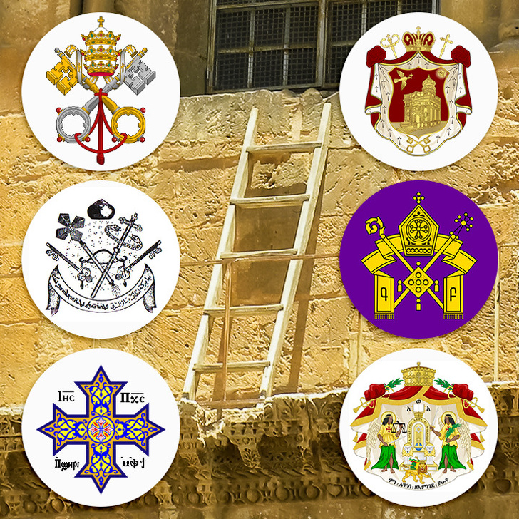 Сходи стоїть перед вікном над входом до Церкви Гробу Господнього в Єрусалимі. Це одне з найсвятіших місць християнства, яке відноситься до IV століття нашої ери. Із-за того що церква вважається чи не найбільш святим місцем у світі, по праву будівля належить 6 церковних конфесій. Тут-то і починається вся плутанина.
