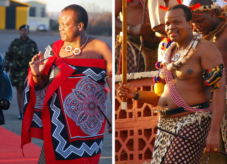 Мсваті III в традиційному вбранні. / Мсваті III в костюмі воїна свази.