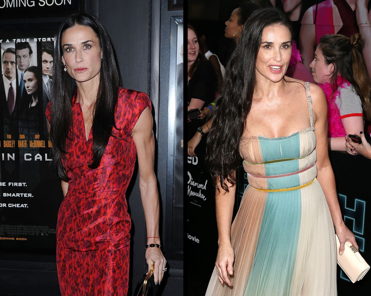 Демі Мур завжди відрізнялася стрункістю, тому що актриса все життя активно займається спортом, йогою і стежить за своїм харчуванням. Однак після розлучення з Ештоном Кутчером вона дуже сильно схудла. На щастя, потім Демі вдалося знову повернутися до своїх колишніх параметрів.