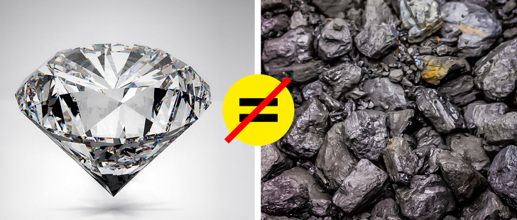 І алмази, і вугілля складаються з вуглецю, але це не означає, що вони одне і те ж. Алмази сформувалися близько 1-3 млрд років тому, в той час як вугілля викопне паливо — утворюється із залишків рослинності протягом мільйонів років. Як бачите, тимчасова різниця істотна. До того ж освіта природних алмазів вимагає дуже високих температур і тиску, яке існує тільки глибоко в мантії Землі.
