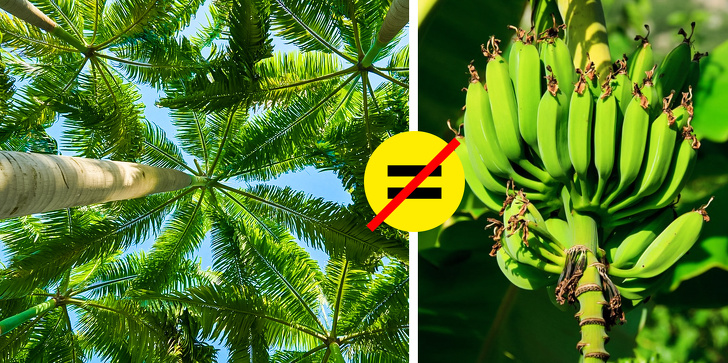 Нічого подібного. Ні на пальмі, ні на будь-якому іншому дереві, ні на кущі, а на... траві. Правда, на дуже високій і дійсно порядком нагадує дерево. Тим не менш банан — це плід рослини, що має велике листя, але не деревний стовбур, а тому і віднесеного до траві за своїм типом. У зв'язку з цим багато сперечаються, що ж таке банан насправді — ягода або фрукт.