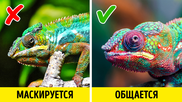 Ці забавні рептилії використовують свій «камуфляж» зовсім не для того, щоб злитися з навколишнім оточенням. Зміна кольору — це в першу чергу своєрідний спосіб спілкування із собі подібними, наприклад реакція на інших самців або можливість привернути самку. Поточний колір хамелеона може бути пов'язаний як із зовнішніми чинниками (температура, освітлення, вологість), так і з його внутрішнім станом (хвороба, голод, злість, страх). Якщо у рептилії стрес, її шкіра стає більш темних відтінків.