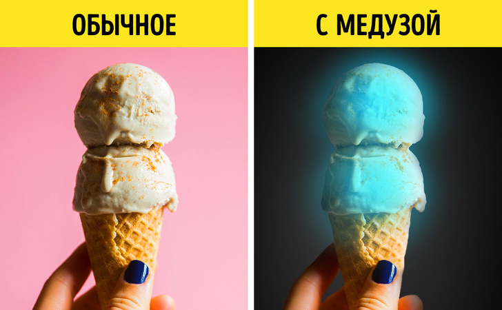 Ще одне нове ласощі, появи якого ми зобов'язані медузам, — світиться морозиво від Lick Me i'm Delicious. Його творці додають у продукт білок медузи, відтворений у лабораторії китайськими вченими. Як тільки ви починаєте є таке морозиво, воно реагує на зовнішній вплив і починає світитися. Правда, ціна такого експериментального ласощі перевищила $ 200, так що невідомо, як скоро ми зможемо побачити його на прилавках супермаркетів.