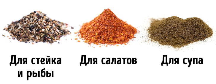 Млини для перцю здатні на більше, ніж думають люди. Приміром, затягніть верхній гвинт на неї і отримаєте мелений перець, який ідеально підходить для супів і соусів. Послабте гвинт трохи, щоб він був встановлений десь посередині, і використовуйте перець середнього помелу для салатів і готових страв. А якщо послабити гвинт, вийде грубий помел, яким сміливо можете приправити стейк і рибу. Якщо ж ви ще не обзавелися подібною штуковиною, просто купуйте перець різного помелу.