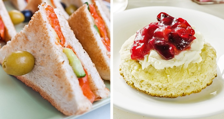 До чаю подаються маленькі трикутні сендвічі без кірок двох видів: з огірком, лососем, яйцем і майонезом і з шинкою і гірчицею. Інші варіанти — булочки, печиво і різні кекси, але завсідник чаювання — це «пенні», маленькі круглі шматочки хліба з маслом і джемом. Їх королева їла ще дитиною в дитячій разом з принцесою Маргарет.