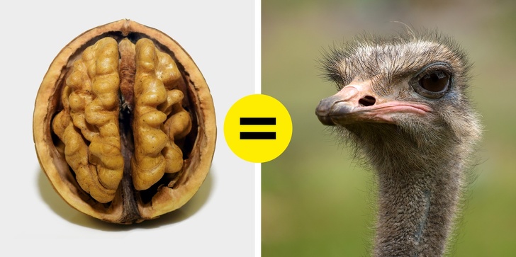 Око страуса порівнюють з більярдними кулями. Їх очні яблука настільки великі, що в черепній коробці затишно себе може почувати тільки мозок розміром з волоський горіх. Маса мозку страуса більше ніж в 2 рази менше маси його очей.