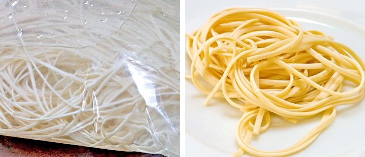 Після того як ви зробили локшину, помістіть її на 1,5 години в zip-пакет з холодною водою — так паста стане м'якше, при цьому не буде злипатися навіть без додавання олії. Після цього вам залишиться лише додати локшину в киплячу солону воду — вона приготується всього за 1 хвилину. Придумали тут.