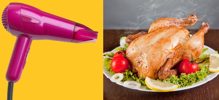 Якщо ви любите курку з хрусткою скоринкою, перед тим як готувати, висушіть її за допомогою фена. Це прибере надлишок вологи з шкіри і допоможе їй швидше підсмажитися і придбати золотистий колір. Цей спосіб також підходить для індички і риби. Переконайтеся самі — ось тут.